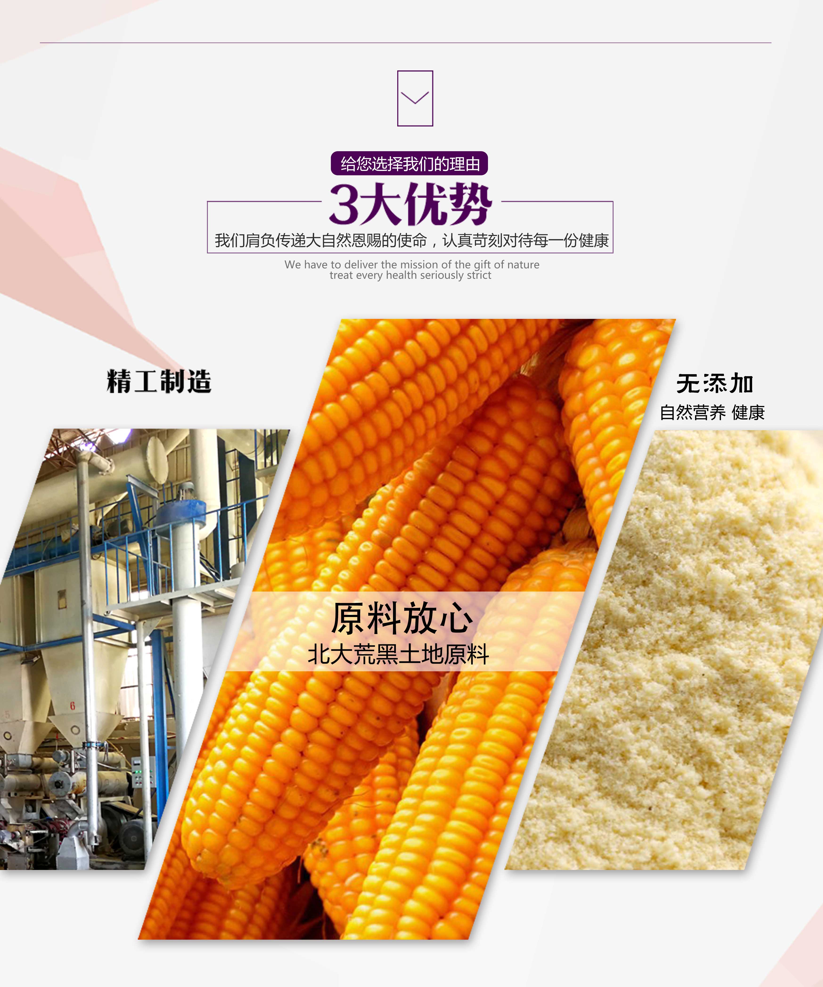产品优势:宠物食品级原料,是生产高档宠物食品、猫粮狗粮,饲料和特种畜禽、水产饲料必不可少的原料之一,经国家权威部门检测,北大荒黑土地的优质原料在高温、高压、高剪切力的膨化过程中使淀粉颗粒膨化并精华,淀粉分子链打开,增加了食品颗粒的表面面积,提高了消化率,淀粉消化吸收,同时使蛋白质肽链裂解为肽和氨基酸,大大提高了蛋白质吸收率。因而膨化原料的使用是促进犬、猫其它动物生长的有效途径。